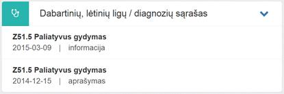 6. Dabartinių, lėtinių ligų / diagnozių sąrašas. Bloke matoma informacija apie tas paciento diagnozes (iš pasirašytų neatšauktų E025/E003 dokumentų), kurios buvo bent vieną kartą registruotos su tipu „‑“ arba kurioms naujausioje naudotojo sukurtoje paciento suvestinėje buvo nurodyta, kad tai – lėtinė diagnozė. Matoma informacija apie diagnozę iš dokumento, kuriame ji buvo įvesta: TLK-10-AM kodas, pavadinimas, data ir aprašymas.