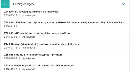 8. Persirgtos ligos. Bloke matoma informacija apie tas paciento diagnozes (iš pasirašytų neatšauktų E025/E003 dokumentų), kurių tipas buvo pažymėtas „-“ arba kurioms naujausioje naudotojo sukurtoje paciento suvestinėje buvo nurodyta, kad tai – persirgta liga. Matoma informacija apie diagnozę iš dokumento, kuriame ji buvo įvesta: TLK-10-AM kodas, pavadinimas, data ir aprašymas.