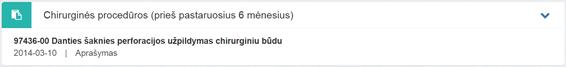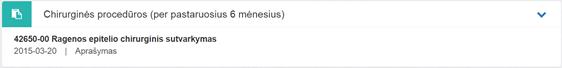 11. Chirurginės procedūros (prieš pastaruosius 6 mėnesius). Bloke rodomos visos chirurginės procedūros iš pasirašytų neatšauktų E025 ir E003 dokumentų, kurioms laiko skirtumas tarp einamosios datos ir procedūros atlikimo datos > 6 mėnesiai. Matoma informacija apie chirurgines procedūras iš dokumento, kuriame jos buvo įvestos: procedūros kodas ir pavadinimas (ACHI), procedūros atlikimo data, procedūros papildomas aprašymas.