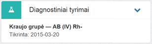 13. Diagnostiniai tyrimai. Bloke matoma kraujo grupės informacija, jei tokia buvo suvesta pasirašytame neatšauktoje E083-1 Vairuotojo sveikatos patikrinimo medicininėje pažymoje. Matoma informacija apie kraujo grupę iš dokumento, kuriame ji buvo įvesta: kraujo grupė, nustatymo data (E083-1 dokumento, iš kurio imama kraujo grupė, sukūrimo data).