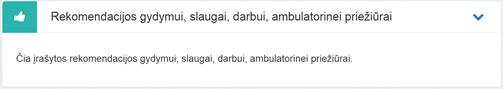 14. Rekomendacijos gydymui, slaugai, darbui, ambulatorinei priežiūrai. Bloke matoma informacija imama iš naujausio pasirašyto neatšaukto E025 arba E003 dokumento bloko Gydymo, slaugos, darbo, ambulatorinės priežiūros rekomendacijos lauko Aprašymas.