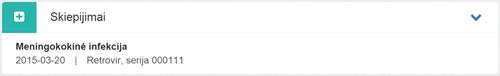 15. Skiepijimai. Bloke rodomi visi paciento ESI įvesti skiepai iš pasirašytų neatšauktų E063 Vakcinacijos įrašas dokumentų. Matoma informacija apie skiepą: užkrečiamoji liga, nuo kurios skiepijama, skiepijimo data, imuninio vaistinio preparato pavadinimas (vaisto prekinis pavadinimas), serijos numeris.