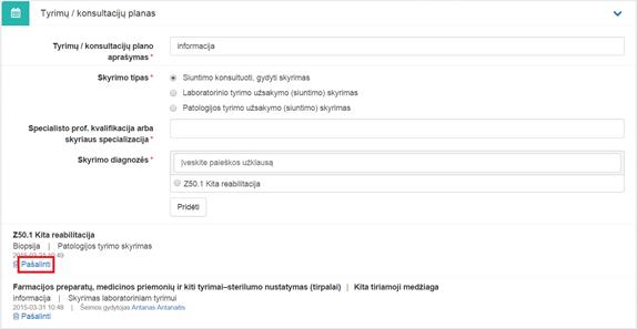 2. Bloko Tyrimų / konsultacijų planas apačioje esančiame pridėtų skyrimų sąraše prie atitinkamo skyrimo paspausti Pašalinti.