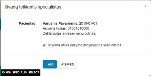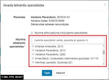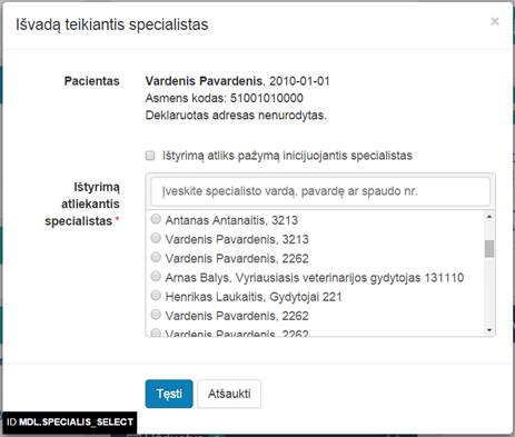 Tokių teisių neturint, langelis yra nepažymėtas ir neaktyvus. Kai langelis nepažymėtas, būtina nurodyti ištyrimą atliekantį specialistą žemiau esančiame lauke.