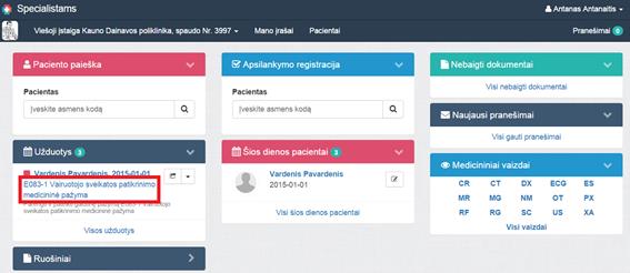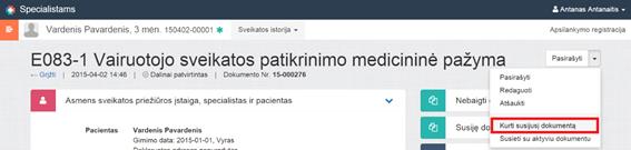 3. Sistema, priklausomai nuo apsilankymo tipo, prie kurio buvo registruota pažyma, automatiškai parenka kurti E025 arba E003 dokumentą, kuriame dalis duomenų automatiškai užpildoma iš susijusios pažymos (skaityti žemiau 4.9.3.2 Pasirinkti kurti susietą dokumentą su pažyma).