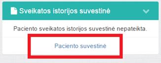 2. Pasirinkti atidaryti paciento suvestinę. Kortelėje Sveikatos istorijos suvestinė paspausti nuorodą Paciento suvestinė.