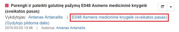 2.3. Kurti pažymą „E049 Asmens privalomojo sveikatos tikrinimo kortelė“, 4.9.24 Kurti pažymą „E083-1 Vairuotojo sveikatos patikrinimo medicininė pažyma“, 4.9.25 Kurti pažymą „E047 Privalomojo sveikatos patikrinimo medicininė pažyma“ (gydytojo pildomą dalį), 4.9.26 Kurti pažymą „E048 Asmens medicininė knygelė“ (gydytojo pildomą dalį).