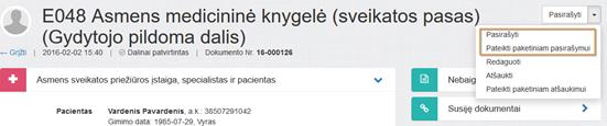 3. Pasirašyti pažymą. Jei pasirašymas vykdomas iš pažymos peržiūros lango, paspausti nuorodą lango viršuje išskleidžiamame meniu Pasirašyti.