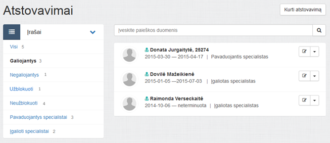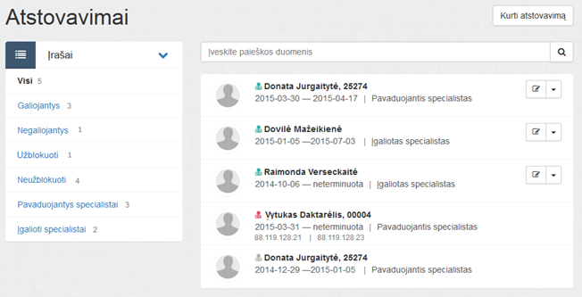 Atstovavimų puslapyje rodomas visų specialistų atstovų sąrašas. Pagal nutylėjimą sąraše rodomi visi įrašai, surūšiuoti pagal būseną (galiojantys, užblokuoti, negaliojantys) ir po to pagal atstovavimo pradžios datą.