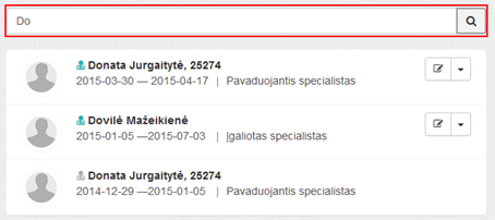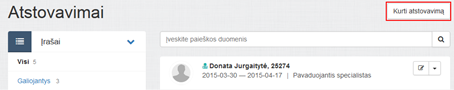 Iš Atstovavimai puslapio galima iškviesti specialisto atstovavimo duomenų tvarkymo funkcionalumą: