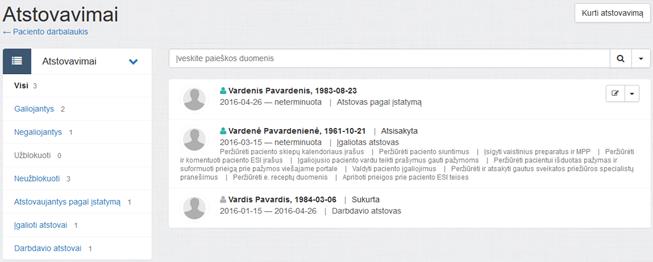 Atstovavimų puslapyje rodomas visų paciento atstovų sąrašas. Pagal nutylėjimą sąraše rodomi visi įrašai, surūšiuoti pagal būseną (galiojantys, užblokuoti, negaliojantys) ir po to pagal atstovavimo pradžios datą.