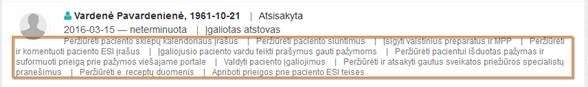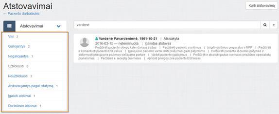 Paciento atstovavimų sąrašo filtrai: