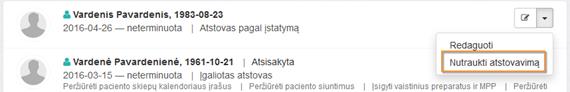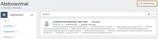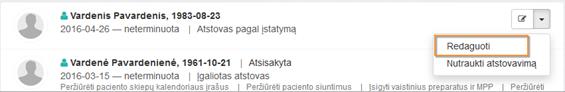 Iš Atstovavimai puslapio galima iškviesti paciento atstovavimo duomenų tvarkymo funkcionalumą: