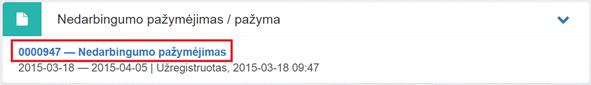 5. Dokumento bloke Nedarbingumo pažymėjimas / pažyma paspausti ant nuorodos [Pažymėjimo numeris] – Nedarbingumo pažymėjimas.