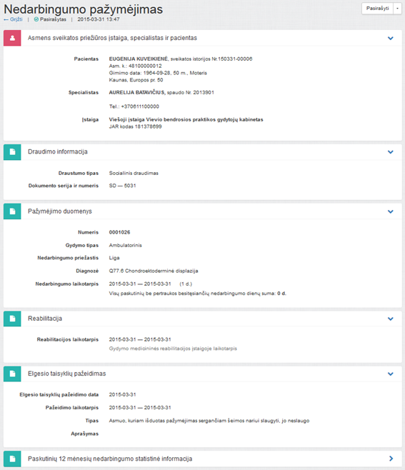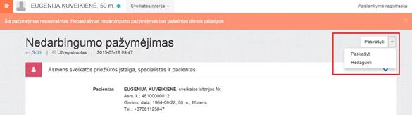 langas. Plačiau apie pasirašymą skaityti skyriuje 4.9.32 Užregistruoti nedarbingumo pažymėjimą.