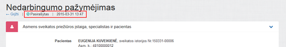 Jeigu nedarbingumo pažymėjimas buvo išsaugotas ESPBI IS ir perduotas į SoDra EPTS (žr. skyrių 4.9.32 Užregistruoti nedarbingumo pažymėjimą), naudotojas gali peržiūrėti tokio pažymėjimo duomenis.