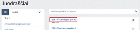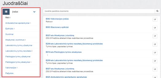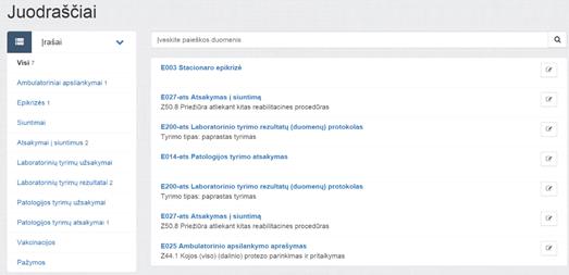 Sąraše apie juodraštį matoma informacija: dokumento kodas ir pavadinimas bei papildomi dokumento duomenys, priklausomai nuo dokumento tipo (diagnozė, tyrimo tipas, imuninio vaistinio preparato pavadinimas ir kt.). Paspaudus ant dokumento pavadinimo atidaromas jo peržiūros langas.