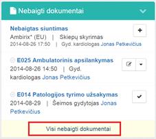 Specialistas gali peržiūrėti informaciją apie pacientui sukurtus dokumentus lange Paciento nebaigti dokumentai, atidaromame iš paciento kortelės (specialisto nebaigti dokumentai, sukurti tam pacientui).
