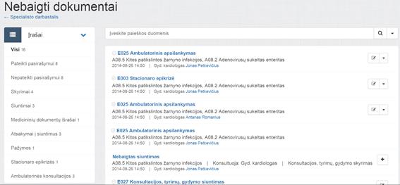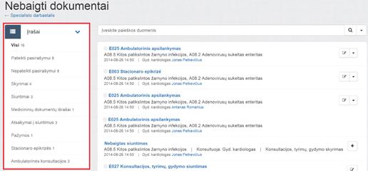 Atsidariusiame lange Nebaigti dokumentai įrašai grupuojami pagal veiksmus, kuriuos leidžiama atlikti, ir rūšiuojami pagal dokumento arba skyrimo atnaujinimo datą. Matomi duomenys prie įrašo: paciento vardas, pavardė (ESI Nr.), gimimo data, dokumento būsena (ikona), dokumento (arba skyrimo) pavadinimas, paslaugos duomenys, dokumento atnaujinimo data, specialistas.
