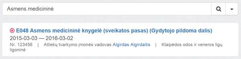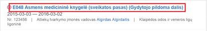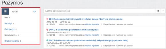 Atsidariusiame lange matomos visos pacientui sukurtos pažymos. Įrašai sugrupuoti pagal dokumento būseną Pasirašytos pažymos papildomai grupuojamos pagal galiojimą, galiojančias rodant viršuje. Įrašai grupėse rūšiuojami pagal pažymos datą, naujausias rodant viršuje.