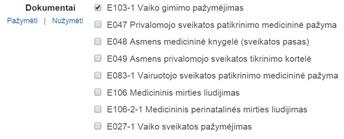 Dokumentai – pasirenkamas pažymos kodas arba pavadinimas.