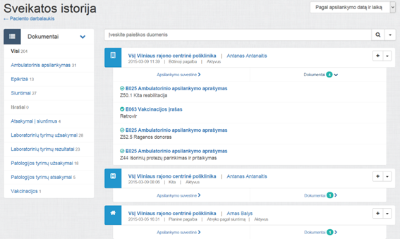Sveikatos istorijoje matomas visų pacientui registruotų apsilankymų ir prie jų sukurtų elektroninių dokumentų sąrašas.