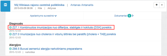 2.2. Sistema parodo prie šio apsilankymo sukurtuose E025 arba E003 dokumentuose nurodytų aktyvių diagnozių ir alergijų sąrašą. Paspausti ant diagnozės arba alergijos, apie kurią norima sužinoti detalesnę informaciją, nuorodos.