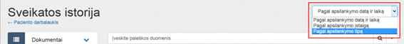 6. Rūšiuoti įrašus. Išskleisti rūšiavimo pasirinkimų sąrašą lango viršutiniame dešiniajame kampe. Pasirinkti norimą rūšiavimo tvarką. Galimi rūšiavimo pasirinkimai: Pagal apsilankymo datą ir laiką (rūšiuojama pagal nutylėjimą), Pagal apsilankymo įstaigą, Pagal apsilankymo tipą.