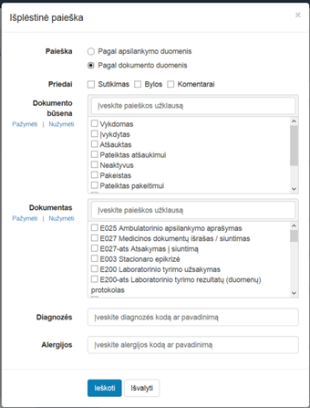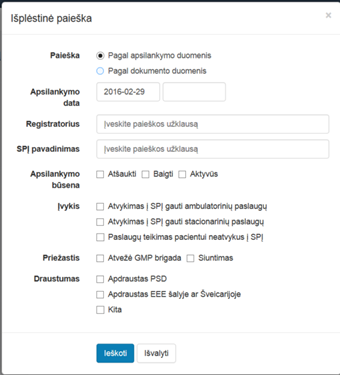 8.3. Atsidariusiame modaliniame lange Išplėstinė paieška nurodyti paieškos kriterijus. Išplėstinę ESI įrašų paiešką galima vykdyti pagal apsilankymo duomenis arba pagal dokumento duomenis, pažymėjus atitinkamą punktą Išplėstinės paieškos lange.