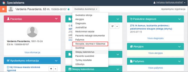 Lange matomi visi paciento ESI išsaugoti elektroniniai dokumentai: receptai, skyrimai ir išdavimai.