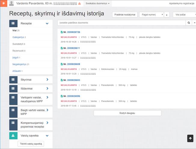 Naudotojas gali peržiūrėti visą pasirinkto paciento istoriją: jam skirtus vaistus ir MPP, išrašytus e. receptus ir kompensuojamuosius popierinius receptus, išduotus vaistus ir MPP, šiuo metu vartojamus vaistus ar naudojamas MPP.