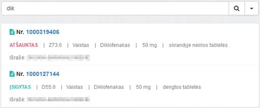Lango dešinėje matoma sąrašo informacija: dokumento numeris (sistemos suteiktas kodas), dokumento būsena, diagnozės kodas, vaistas ar MPP, bendrinis vaisto ar MPP pavadinimas, farmacinė forma, SPĮ specialistas kuris išrašė ar išdavė vaistą ar MPP.