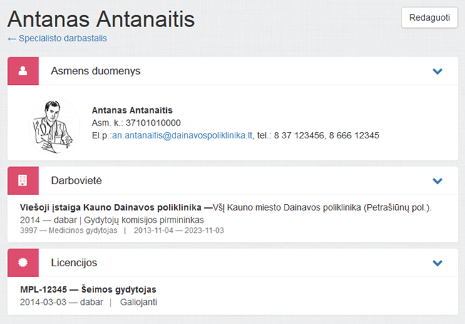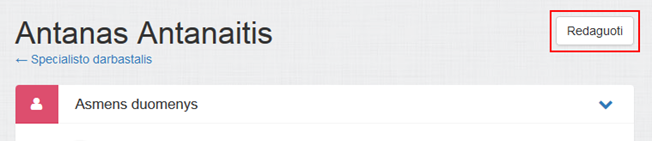 Iš puslapio galima iškviesti specialisto duomenų redagavimo funkcionalumą (žr. skyrių 4.27.2 Redaguoti specialisto duomenis) paspaudus mygtuką puslapio dešinėje Redaguoti.