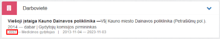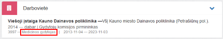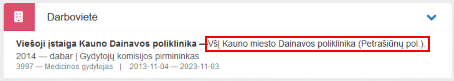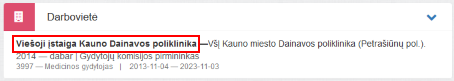 2. Darbovietė. Bloke matomi prisijungusio specialisto darbovietės duomenys iš ESPBI IS sveikatinimo įstaigų katalogo.