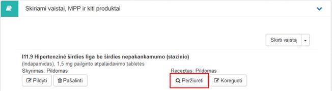 Priklausomai nuo skyrimo ir nuo recepto būsenos, atsidariusiame recepto peržiūros lange galimi šie veiksmai: