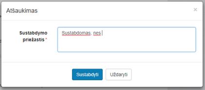 e. recepto sustabdymo forma, kur reikia įvesti sustabdymo priežastį.