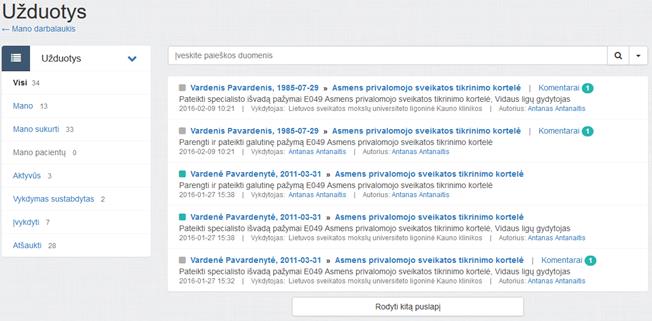 Užduotys puslapyje rodomas specialisto užduočių sąrašas. Kriterijai, pagal kuriuos užduotys įtraukiamos į sąrašą, aprašyti skyriuje 4.30 Tvarkyti užduotis. Pagal nutylėjimą sąraše rodomiems įrašams taikomas filtras Visi, įrašai rūšiuojami pagal užduoties datą.