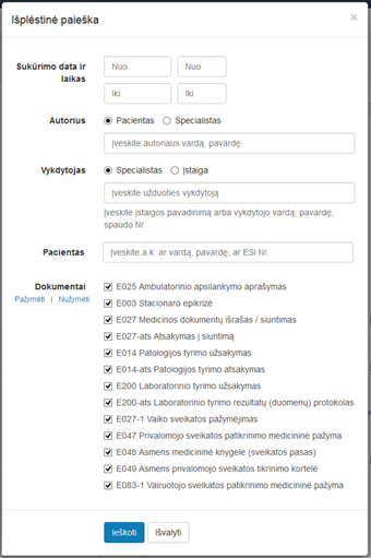 2. Atsidariusiame modaliniame lange Išplėstinė paieška nurodyti paieškos kriterijus.