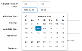 Datos ir laiko reikšmes leidžiama pasirinkti iš išskleidžiamo komponento arba