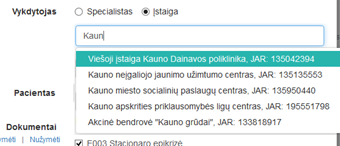 įstaigos pavadinimą atitinkamai ir iš pagal įvestą užklausą rodomų pasirinkimų