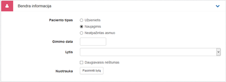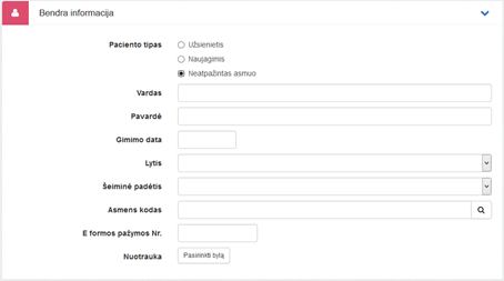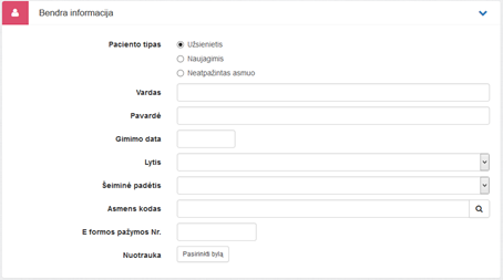 1. Bendra informacija. Bloke pildoma pagrindinė paciento informacija. Pildomi laukai priklauso nuo to, koks paciento tipas pasirinktas. Bendros informacijos bloke rodomi laukai skirtingiems pacientų tipams: