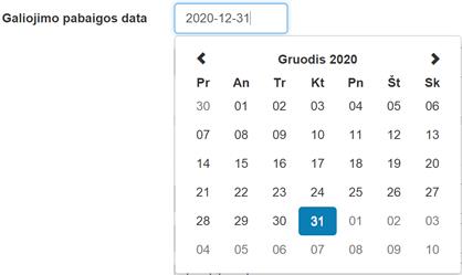 Galiojimo pabaigos data – įvedama arba pasirenkama Europos