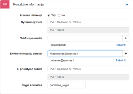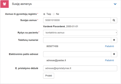 Leidžiama pridėti daugiau nei vieną susijusio asmens elektroninio pašto adresą. Pridėtas adresas matomas sąraše po lauku.