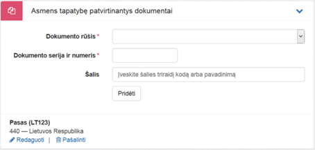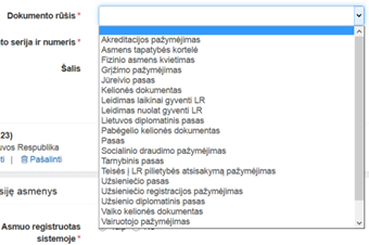 Dokumento rūšis – lauke pasirenkama asmens tapatybę