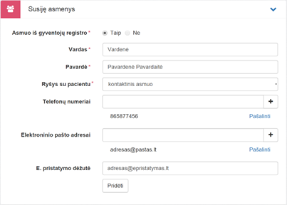 nurodytą bloke Susiję asmenys. Pvz., jei pacientas turi susijusį asmenį Vardenis