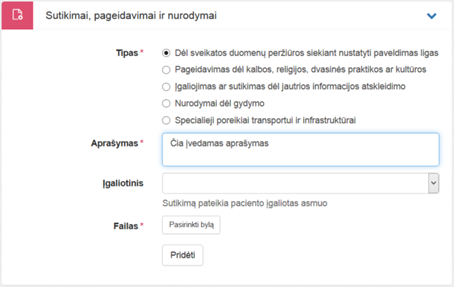 Sutikimai. Bloke galima pridėti paciento sutikimus.