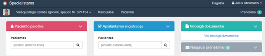 Pradinį specialistų portalo langą sudaro žemiau nurodyti elementai: