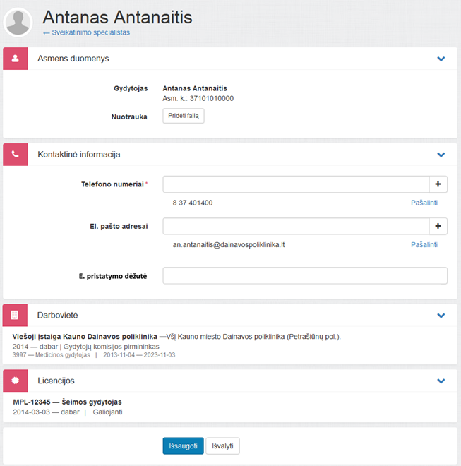 Pakeitus duomenis specialisto duomenų redagavimo puslapyje, galima pasirinkti išsaugoti pakeitimus (Išsaugoti) arba išvalyti puslapyje atliktus pakeitimus (Išvalyti).