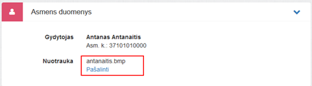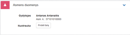 4. Asmens duomenys. Bloko lauke Gydytojas matomi specialisto vardas (-ai) pavardė (-ės) ir asmens kodas iš ESPBI IS sveikatinimo specialistų katalogo, kurių keisti neleidžiama. Bloke redaguojami laukai:
