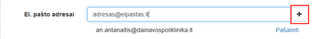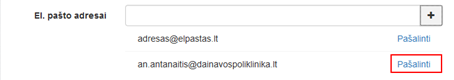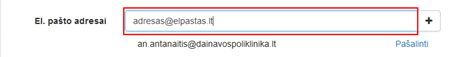 Pridėtas elektroninio pašto adresas matomas sąraše po įvedimo lauku. Leidžiama pridėti daugiau nei vieną elektroninio pašto adresą. Paspaudus sąraše šalia elektroninio pašto adreso rodomą nuorodą Pašalinti įvestas elektroninio pašto adresas ištrinamas iš sąrašo.